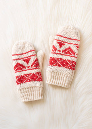 Cream & red patterned knit mittens. Fleece lined. 100% Acrylic. One Size.