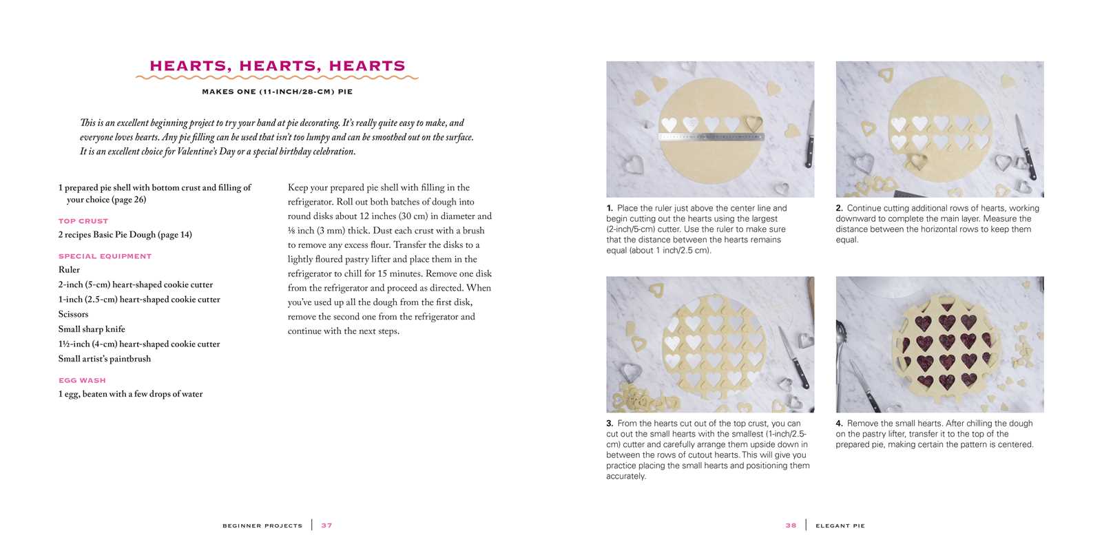 Pies can be as stunningly attractive as the most decorative cakes with the use of some basic techniques and the appropriate care when working with pie dough. The recipes and techniques in this book give any home baker the tools to create breathtaking works of pie art. From preparation of the dough to the last moments of baking, all methods are clearly presented using step-by-step photographs. A flat surface, rolling pin, sharp knife, and cookie cutters of different sizes and shapes make embellishing an ordinary pie crust easy. 25 designs