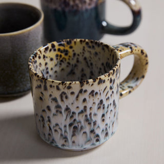 Starling speckled ceramic coffee mug. Reactive glaze with black speckles.Size: 5.5" x 3.5" x 3.25"